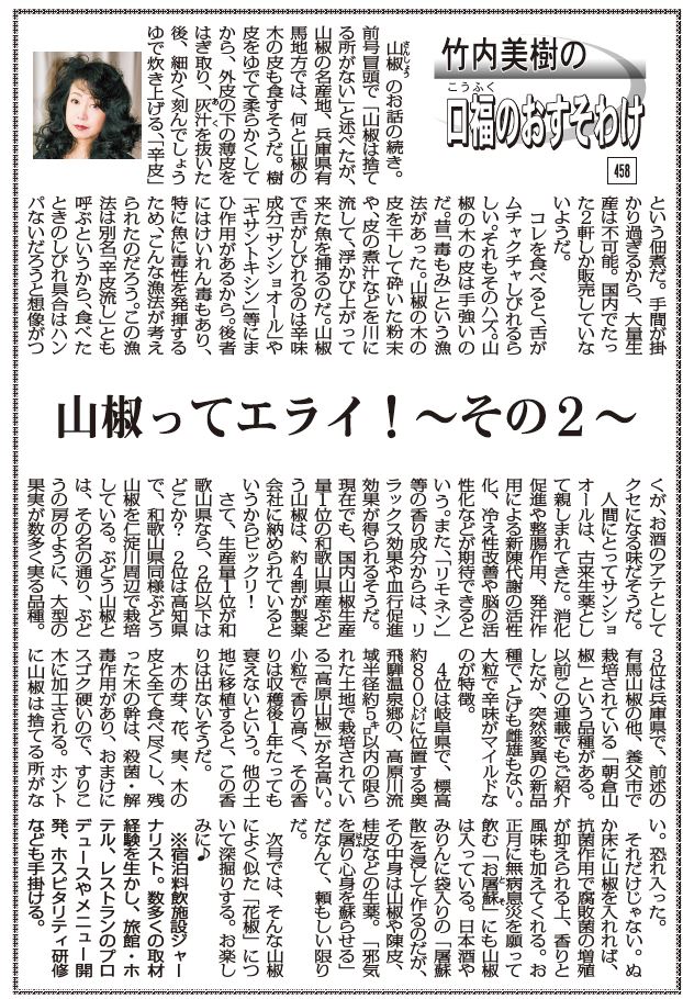 山椒(さんしょう)のお話の続き。前号冒頭で「山椒は捨てる所がない」と述べたが、山椒の名産地、兵庫県有馬地方では、何と山椒の木の皮も食すそうだ。樹皮をゆでて柔らかくしてから、外皮の下の薄皮をはぎ取り、灰汁(あく)を抜いた後、細かく刻んでしょうゆで炊き上げる、「辛皮」という佃煮だ。手間が掛かり過ぎるから、大量生産は不可能。国内でたった2軒しか販売していないようだ。