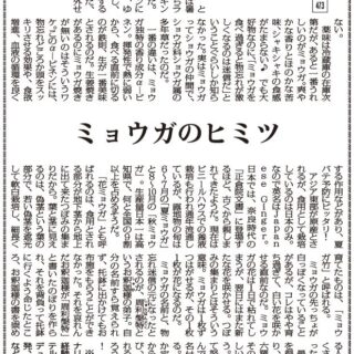 アジア東部が原産とされるが、食用として栽培しているのは日本のみ。なので英名はJapanese Ginger。日本では、奈良時代の「正倉院文書」に登場するほど、古くから親しまれてきたようだ。現在はビニールハウスでの養液栽培も行われ通年流通しているが、露地物の旬は6~7月の「夏ミョウガ」と8~10月の「秋ミョウガ」。生産量日本一は高知県で、何と全国の9割以上を占めるそうだ。