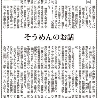 五節句の一つ七夕に索餅を食べると疫病にかからないという中国の故事に倣い、平安時代宮中の儀式では欠かせない供物だった。7月7日はそうめんの日でもある。織姫にあやかり裁縫の上達を願い、糸のようなそうめんを食した。だから夏の風物詩と思うが、実は夏の季語ではない。俳句歳時記には「冷索麺(ひやそうめん)」や「流し索麺」はあるが、「索麺」だけでは季語としないとあった。昔は四季を問わず慶事や弔事に食べていたからだといわれる。