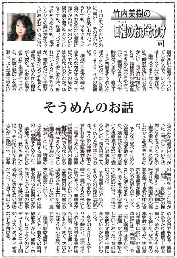今や明太クリームやトリュフ味など、進化形そうめんを提供する専門店も出現、人気を博しているそうだ。さて、次はどんなそうめんを食べようかな?