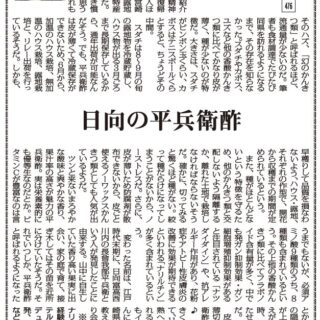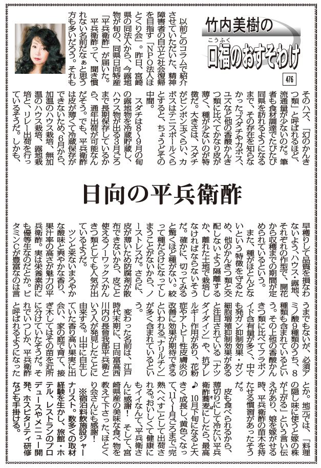 以前このコラムで紹介させていただいた、精神障害者の自立と社会復帰を目指す「NPO法人ほとくり会」。昨日、宮崎県の同法人から、今露地物が旬の、同県日向特産「平兵衛酢」が届いた。
