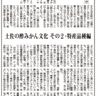 土佐の酢みかん文化の続き。前号で「ぶしゅかん」の正体は次号に譲るとしたが、一体何? また、全国1位のシェアを誇るという「直七(なおしち)」や「餅柚(もちゆ)」って?