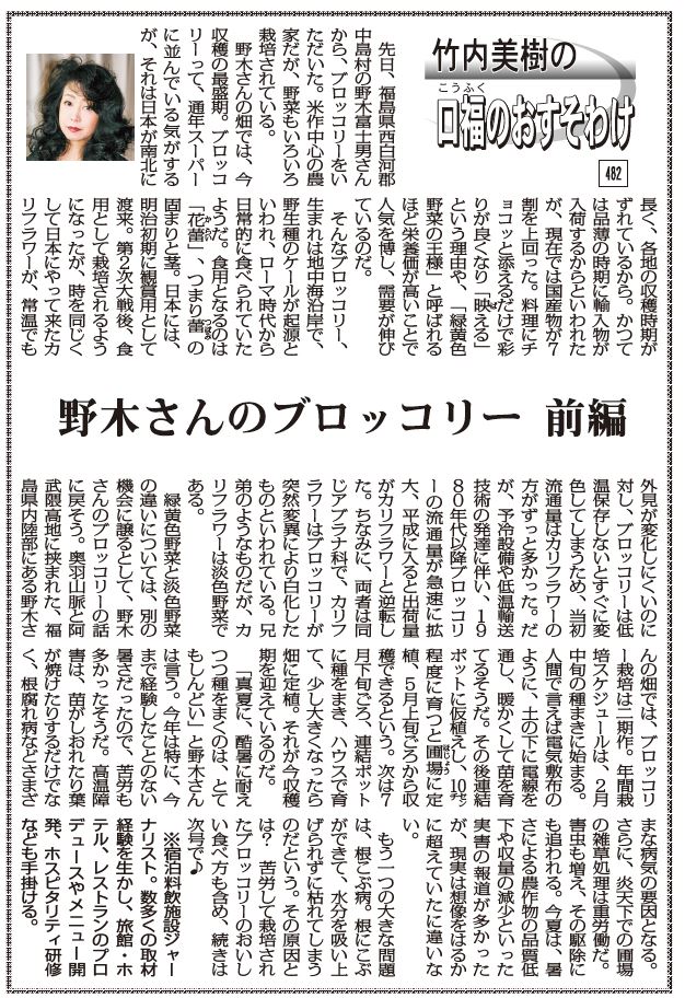 先日、福島県西白河郡中島村の野木富士男さんから、ブロッコリーをいただいた。米作中心の農家だが、野菜もいろいろ栽培されている。