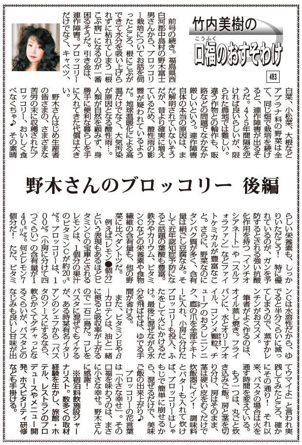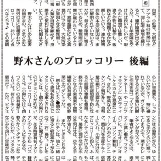 前号の続き。福島県西白河郡中島村の野木富士男さんから、ブロッコリー栽培についてお話を伺ったところ、根にこぶができて水分を吸い上げられずに枯れてしまう「根こぶ病」になるのが一番困るそうだ。引き金は、連作障害。ブロッコリーだけでなく、キャベツ、白菜、小松菜、大根などアブラナ科の野菜は全て、同じ畑で栽培を続けると、連作障害が出るそうだ。4~5年間隔を空ければ良いらしいが、限られた農地では難しい。違う作物との輪作も、販路などの問題でなかなか厳しいという。連作障害自体の本当の原因は、まだ解明されていないそうだが、昔より確実に増えているため、酸性雨の影響が疑われているようだ。地球温暖化による高温だけでなく、大気汚染が原因となる酸性雨…。人類が自然を顧みず、身勝手に便利な暮らしを手に入れてきた代償は大きい。