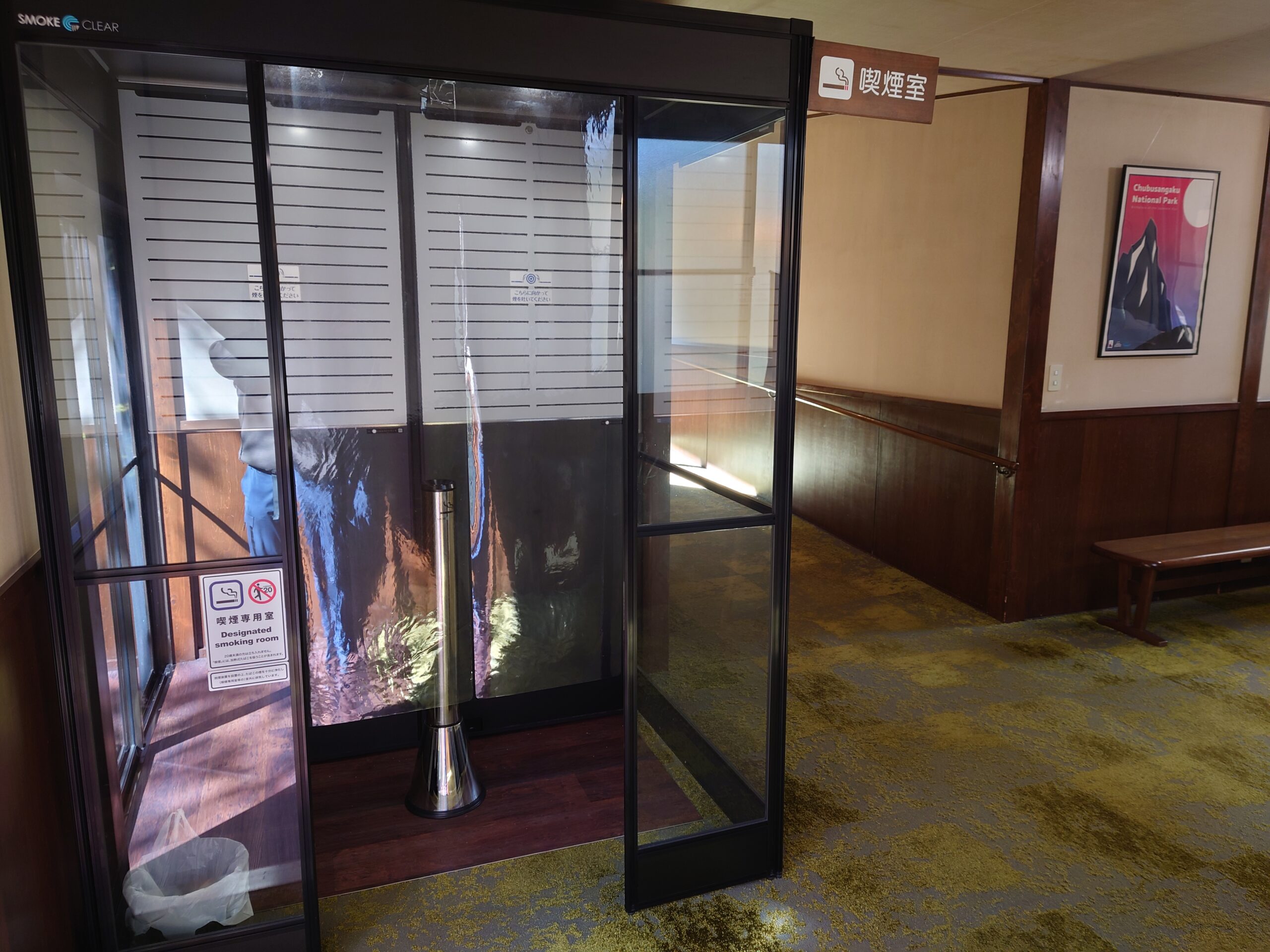 同館では今年6月から、受動喫煙対策の一環として、エルゴジャパン(東京都品川区)が開発した高性能喫煙ブース「SMOKE CLEAR(スモーククリア)」シリーズの4人用を1台設置した。