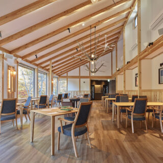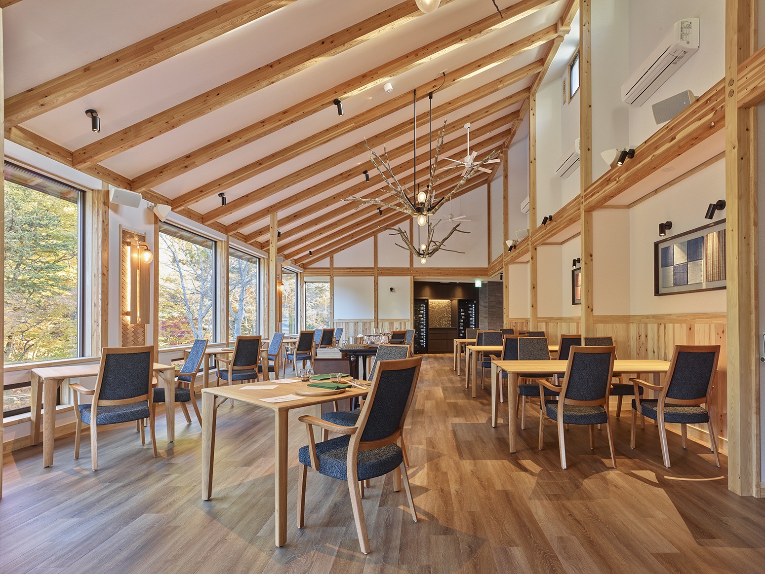 建物はホテルに隣接する敷地内に木造2階建てで新築。外観はモスグリーンの落ち着いた色合いが基調でレストラン内は、自然や木のぬくもりを感じる落ち着きのある上質な空間が特徴だ。