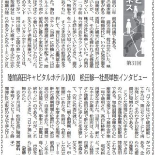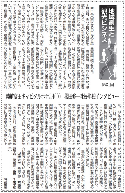 電気料金の高騰や人手不足など、ポストコロナで、被災地のホテル経営に課題は山積だ。しかも、市議との二足のわらじに民衆の理解を得るには、相当の努力が必要だろう。松田氏の苦悩も見え隠れした。市と包括協定の覚書を交わした共立メンテナンスは、近く「ドーミーインEXPRESS陸前高田」を開業する予定だ。チェーン系ホテルの進出は相乗効果も高く、松田氏も期待を寄せている。