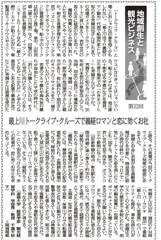 「トークライブ・クルーズ」と聞くとおしゃれな印象を抱くかもしれない。「最上川舟下り義経ロマン観光」代表で船頭作家として知られる芳賀由也さんはこれまでの舟運ガイドをトークライブ・クルーズに言い換えて、若年世代の取り込みに経営のかじを切った。