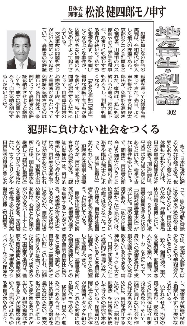 いずれにせよ、治安の良さを誇り、安全な町づくりに自治体は取り組まねばならない。そして、犯罪に負けない社会を作らねばならない。そのためには、再犯を防止するために、いかに「認知行動療法」を出所後も継続して行うかの研究が求められている。保護司の活躍に任せるのか、自治体が保護司とタッグを組むのか、これらの対策に取り組むべきである。