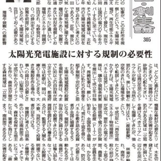 昨年11月、長崎幸太郎知事が、この北杜市を視察したという。太陽光発電が、再生可能エネルギーとして普及し、現在では国内の電力の7%をカバーするに至っている。そこで長崎知事は、北杜市の太陽光発電の現状を見ておきたいと考えたのであろう。近年、普及した太陽光発電に関する問題点が多々あり、放置できない状況を視察しておきたかったに違いない。環境とエネルギー問題が注目され、与野党共にCO2の排出をゼロにする政策を前面に押し出しているため、太陽光発電に注目しておく必要があろう。