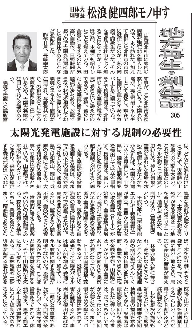 環境や景観への悪影響は、どんどん進むだけにとどまらず、災害時の土砂崩れの心配も大きい。これでは周辺住民とのトラブルが起こって当然と思われる。美しい景観と空気のきれいな環境を求めて転居してきた人たちからすれば、太陽光発電パネルは見苦しい。山梨県は、議会で規制条例案を提出して成立を目指す。長崎知事は、厳しい人だけに私たちの想像を超す規制で対応すると思われる。