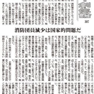 地方自治体の消防体制は、署員だけではまかなえず、消防団の協力が不可欠である。とりわけ自然災害には員数が必要であるとともに、詳細な地理の知識を持つ人が大切だ。その団員が減少してきたのは国家的な問題でもあろう。