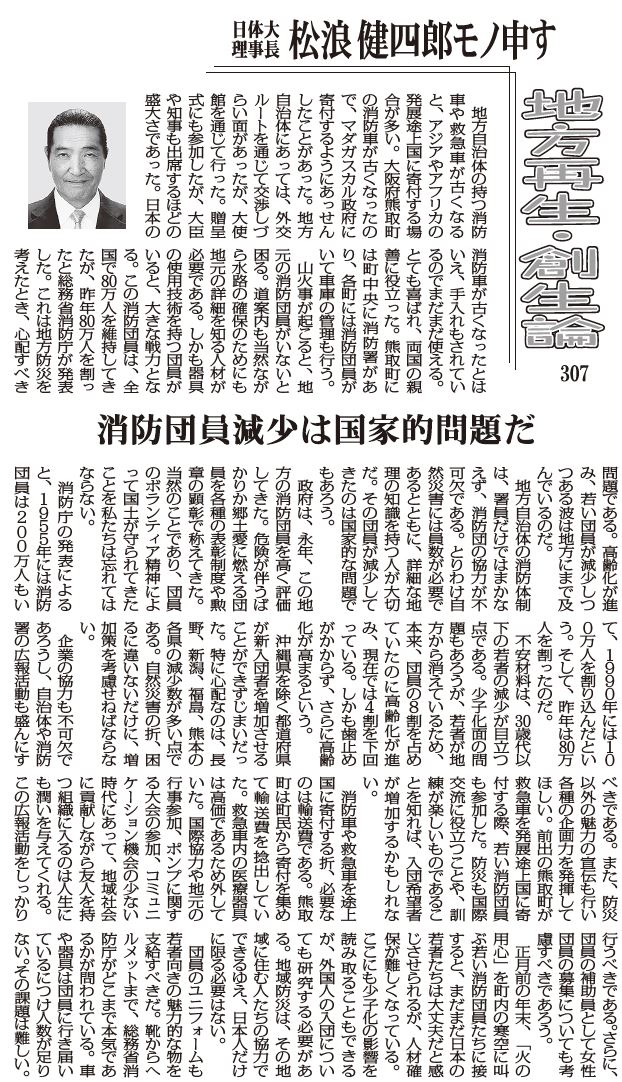 【地方再生・創生論 307】消防団員減少は国家的問題だ 松浪健四郎
