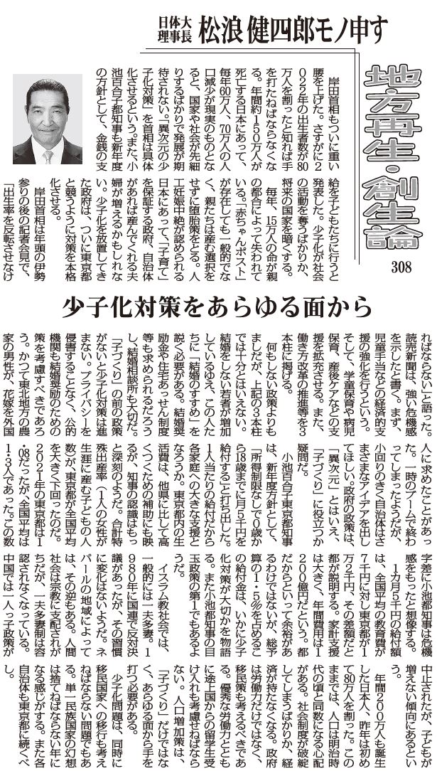 「異次元の少子化対策」を首相は具体化させるという。また、小池百合子都知事も新年度の方針として、金銭の支給を子どもたちに行うと発表した。少子化が社会の活動を奪うばかりか、将来の国家を暗くする。
