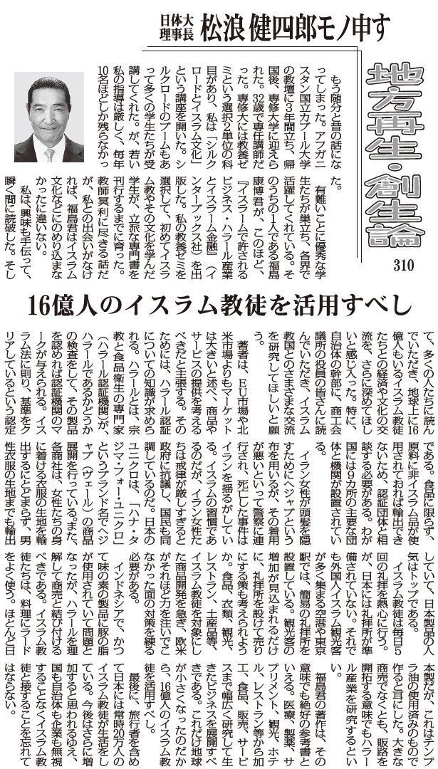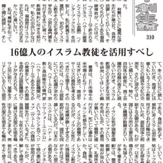 私は、興味も手伝って、瞬く間に読破した。そして、多くの人たちに読んでいただき、地球上に16億人もいるイスラム教徒たちとの経済や文化の交流を、さらに深めてほしいと感じ入った。特に、自治体の幹部に、商工会議所の役員の皆さんに読んでいただき、イスラム教国とのさまざまな交流を研究してほしいと願う。