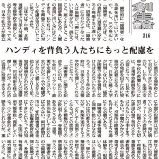 「障害者」に関する記述をしたのは、私たちの社会は、バリアフリー政策が定着したとはいえ、まだまだ不十分で配慮が足りないと感じるからに他ならない。2013年、知的障害などのため成年後見人が付いた人の選挙権が、司法判断を経て回復した。だが、そのために容易に投票できるように全国の投票所は対応しているだろうか。常に弱者ファーストの姿勢が大切だが、投票という大切な表現の場で苦労させてはならないのは申すまでもない。手間がかかろうとも、投票所は障害者でも行きたくなるような場にする必要がある。