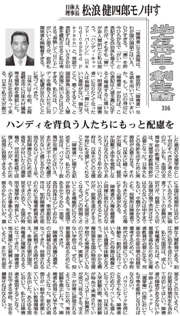 【地方再生・創生論 316】ハンディを背負う人たちにもっと配慮を 松浪健四郎