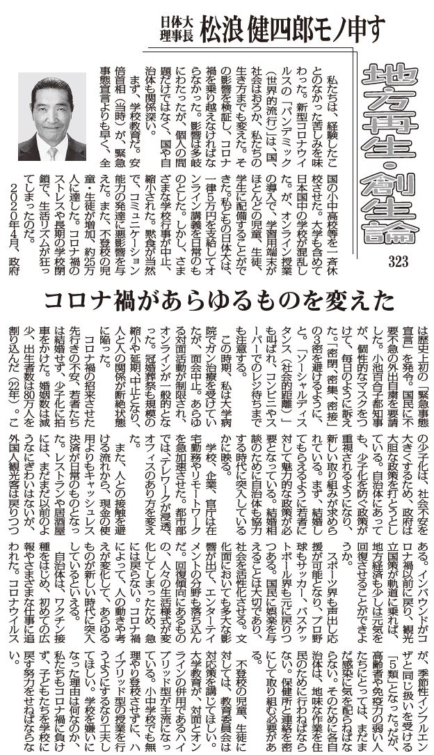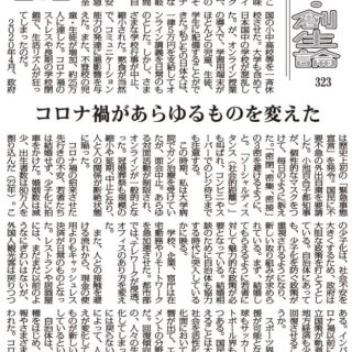 まず、学校教育だ。安倍首相(当時)が、緊急事態宣言よりも早く、全国の小中高校等を一斉休校させた。大学も含めて日本国中の学校が混乱した。が、オンライン授業の導入で、学習用端末がほとんどの児童、生徒、学生に配備することができた。私どもの日体大は、一律5万円を支給してオンライン講義を日常のものとした。しかし、さまざまな学校行事が中止、縮小された。黙食が当然で、コミュニケーション能力の発達に悪影響を与えた。また、不登校の児童・生徒が増加、約25万人に達した。コロナ禍のストレスや長期の学校閉鎖で、生活リズムが狂ってしまったのだ。