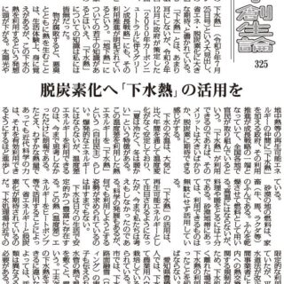 物が腐敗すると、悪臭とともに熱を生むことは、生活体験上、身に覚えがあるが、この下水の熱を利用するという発想に頭が下がる。太陽光や地中熱等の再生可能エネルギーの仲間に「下水熱」を加える政府、その利用推進が成長戦略の一端となっていて、全国各地で官民が取り組んでいるという。「下水熱」が利用できるのであれば、そのメリットは大きいばかりか、脱炭素に期待できる感じがする。