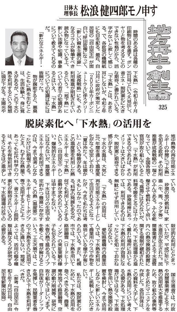 「新たなエネルギー・下水熱」(令和5年7月25日号)という大見出し、省エネ・脱炭素化に大きな期待、と書かれている。「下水熱」とは、あまり耳にしないが、令和2年12月に政府が策定した「2050年カーボンニュートラルに伴うグリーン成長戦略」にも、その利用推進が明記されているという。「地下熱」についての若干の知識があるとはいえ、「下水熱」についての知識は私には皆無だった。