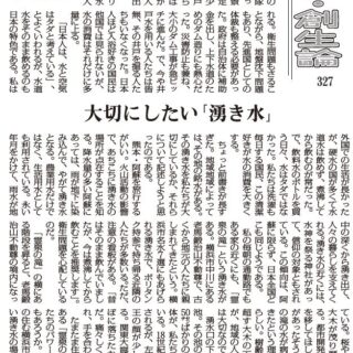 そういえば、故郷の泉佐野市でも鳥居を建てて大切にしていたし、「水呑神社」なる神社もあった。私たちの先祖は、水を大切にしたばかりか、湧き水は神からの贈り物と考えてきた。開発が全国で見られるが、湧水口を守り抜いてほしいと訴える。