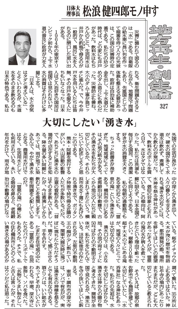 【地方再生・創生論 327】大切にしたい「湧き水」 松浪健四郎