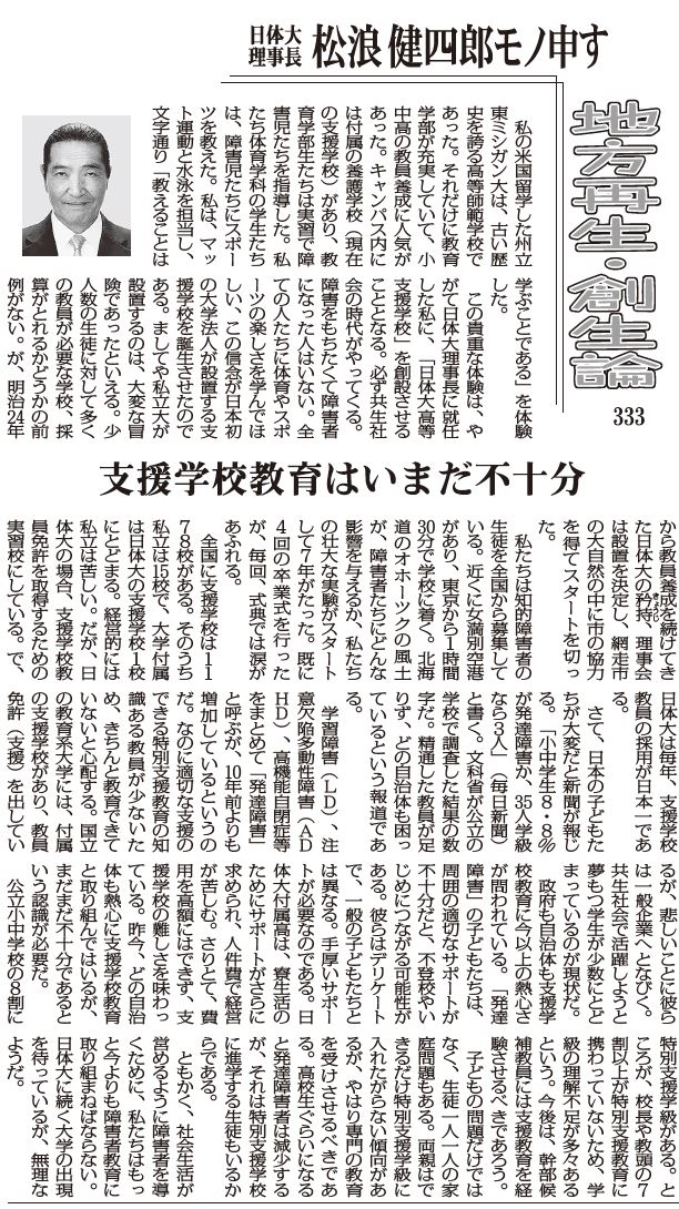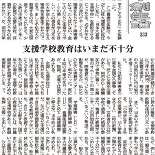 政府も自治体も支援学校教育に今以上の熱心さが問われている。「発達障害」の子どもたちは、周囲の適切なサポートが不十分だと、不登校やいじめにつながる可能性がある。彼らはデリケートで、一般の子どもたちとは異なる。手厚いサポートが必要なのである。日体大付属高は、寮生活のためにサポートがさらに求められ、人件費で経営が苦しむ。さりとて、費用を高額にはできず、支援学校の難しさを味わっている。昨今、どの自治体も熱心に支援学校教育と取り組んではいるが、まだまだ不十分であるという認識が必要だ。