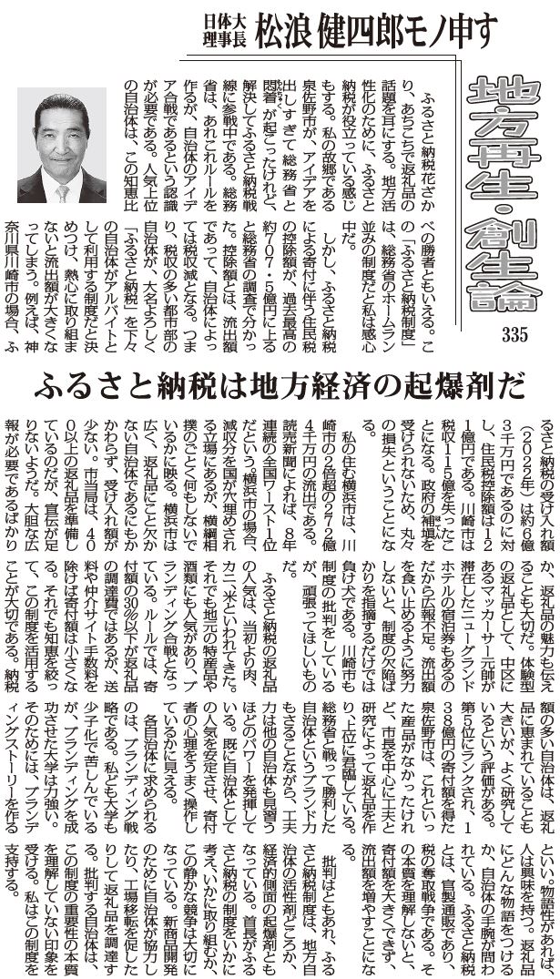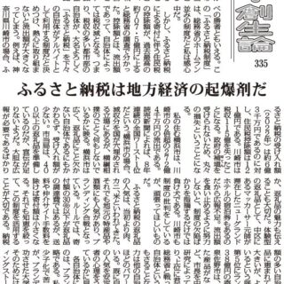 批判はともあれ、ふるさと納税制度は、地方自治体の活性剤どころか、経済的側面の起爆剤ともなっている。首長がふるさと納税の制度をいかに考え、いかに取り組むか、この静かな競争は大切になっている。新商品開発のために自治体が協力したり、工場移転を促したりして返礼品を調達する。批判する自治体は、この制度の重要性の本質を理解していない印象を受ける。私はこの制度を支持する。