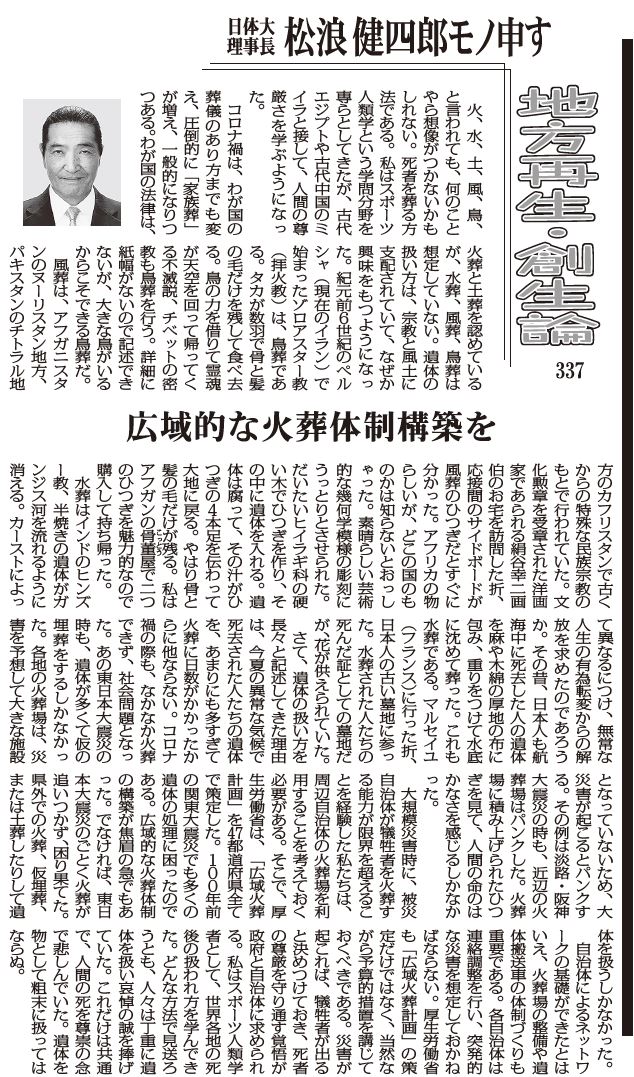 自治体によるネットワークの基礎ができたとはいえ、火葬場の整備や遺体搬送車の体制づくりも重要である。各自治体は連絡調整を行い、突発的な災害を想定しておかねばならない。厚生労働省も「広域火葬計画」の策定だけではなく、当然ながら予算的措置を講じておくべきである。災害が起これば、犠牲者が出ると決めつけておき、死者の尊厳を守り通す覚悟が政府と自治体に求められる。私はスポーツ人類学者として、世界各地の死後の扱われ方を学んできた。どんな方法で見送ろうとも、人々は丁重に遺体を扱い哀悼の誠を捧げていた。これだけは共通で、人間の死を尊崇の念で悲しんでいた。遺体を物として粗末に扱ってはならぬ。