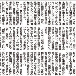 国土交通省は、バスやタクシーの運転手に義務付けていた車内での「氏名掲示」を廃止する。運転手の個人情報保護のほか、カスハラと称されるカスタマーハラスメントいわゆる顧客による嫌がらせから従業員を守るという側面もある。現に、運転手の顔写真入りの名札をスマホで撮影する乗客もいるらしく、女性運転手にしてみれば恐怖以外の何物でもない。