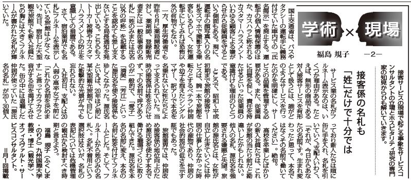 旅館業界では、仲居改め接客係の地位向上のため源氏名を使わず本名で働ける職場づくりに取り組んできた。源氏名を本名の名前に変え、本名の名前に姓を付けてフルネームとした。そして、フルネームから姓のみの名札へ。名札不着用という選択肢はないが、名札の表記については危機管理の観点から検討すべき時期と言えよう。