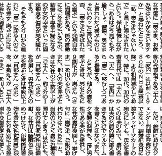 不倫関係と思しき年の離れた2人連れの男女が宿泊した際、年配の係が、女性客に「奥さま、お飲み物はいかがなさいますか」と尋ねたところ、「私、奥さまじゃないんで」と言下に否定されたという。係は憤慨しながら「あれはどう見ても不倫でしょ。普通、奥さまと言われたら喜ぶものじゃないのッ」と言い放つ。否、「奥さまと呼ばれたら喜ぶ」という発想自体に問題がある。係の言動には、女は家にいるもの、結婚して専業主婦になるのが女の幸せといった固定観念や偏見が見え隠れする。