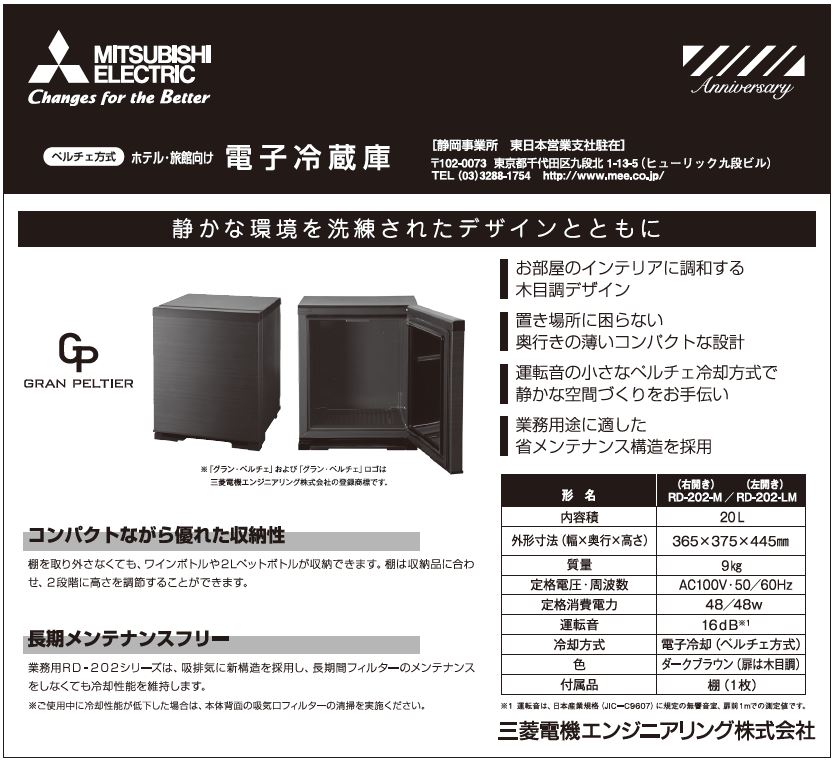 最新式の「20リットルタイプ電子冷蔵庫」は、奥行きを375ミリと薄くしたことが最大の特長。インテリア性の高い外観デザインには、ダークブラウンを基調とした木目調を採用したことにより高評価を得ている。また、吸排気の内部構造を改良し、メンテナンスの手間を省く長期メンテナンスフリーを実現。小型ながら2リットルのぺットボトルも収納できる。デザイン性、安眠などの快適性が求められるラグジュアリーホテルや高級旅館、限られたスペースを最大限に有効活用したいビジネスホテルなどで販売実績を伸ばしている。