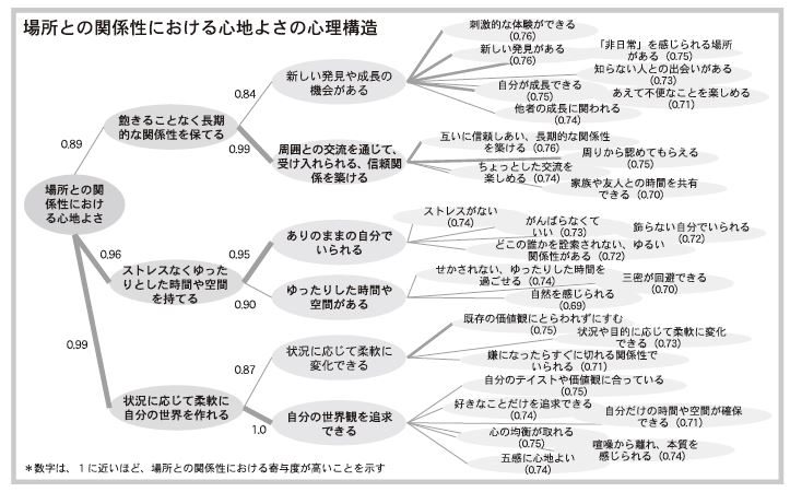 また、それぞれの因子の背後には、(1)飽きることなく長期的な関係性を保てる(2)ストレスなくゆったりとした時間や空間を持てる(3)「状況に応じて柔軟に自分の世界を作れる―の三つの潜在的な要因が隠されていることが示唆されました。