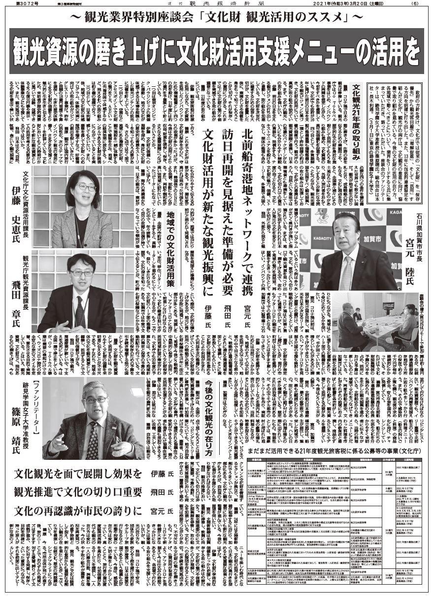 政府の方針を受け、文化庁では従来の「文化財」を「保存優先」から観光客目線での「理解促進」、そして「活用」する方向を明確に打ち出した。また、13年に包括的連携協定を結んだ文化庁、観光庁の両庁は、文化観光の推進に向け、協働で取り組みを進めている。今後の文化財の活用の在り方、各地域で動くべきことについて、業界をリードする3氏に集まっていただき、語っていただいた。座談会のファシリテーターは、跡見学園女子大学准教授の篠原靖氏。総合司会は本社・長木利通。(3月1日に東京の跡見学園女子大学で)