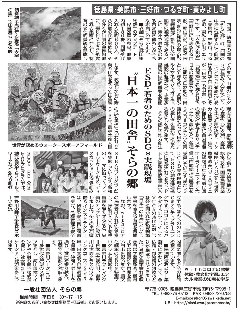 そらの郷は「地方創生の成功事例」といわれ、2016年、農林水産大臣から「食と農の景勝地」の認定。18年、国連食糧農業機関(FAO)から「世界農業遺産(GIAHS)」の認定。20年には、第17回オーライ!ニッポン大賞、「内閣総理大臣賞」を受賞しています。また、SDGsの実践現場として、ESDの地域推進拠点に登録されており、「PBL(課題解決型学習)×STEAMプログラム」を実施しています。各校のテーマに沿って、フィールドワーク・WS、ディスカッションなどを組み立てる、ほんもののSDGsアクティブラーニングです。コロナによるパラダイムシフト、そしてVUCAの時代に対し、社会に開かれた教育現場「日本一の田舎」として、未来を変える若者を育成します。