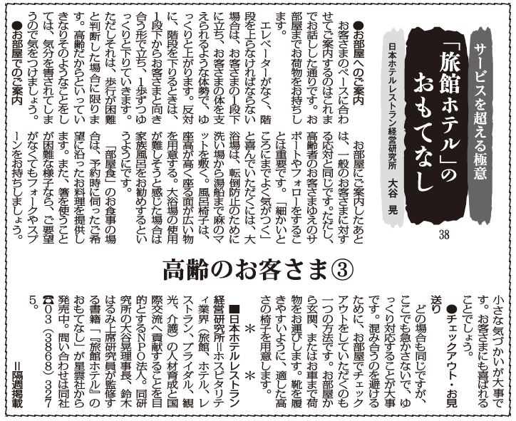 ■日本ホテルレストラン経営研究所=ホスピタリティ業界(旅館、ホテル、レストラン、ブライダル、観光、介護)の人材育成と国際交流へ貢献することを目的とするNPO法人。同研究所の大谷晃理事長、鈴木はるみ上席研究員が監修する書籍「『旅館ホテル』のおもてなし」が星雲社から発売中。問い合わせは同社TEL03(3868)3275。