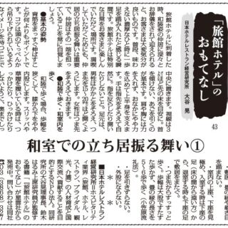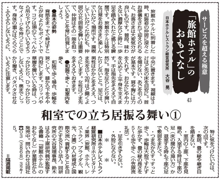 ■日本ホテルレストラン経営研究所=ホスピタリティ業界(旅館、ホテル、レストラン、ブライダル、観光、介護)の人材育成と国際交流へ貢献することを目的とするNPO法人。同研究所の大谷晃理事長、鈴木はるみ上席研究員が監修する書籍「『旅館ホテル』のおもてなし」が星雲社から発売中。問い合わせは同社TEL03(3868)3275。