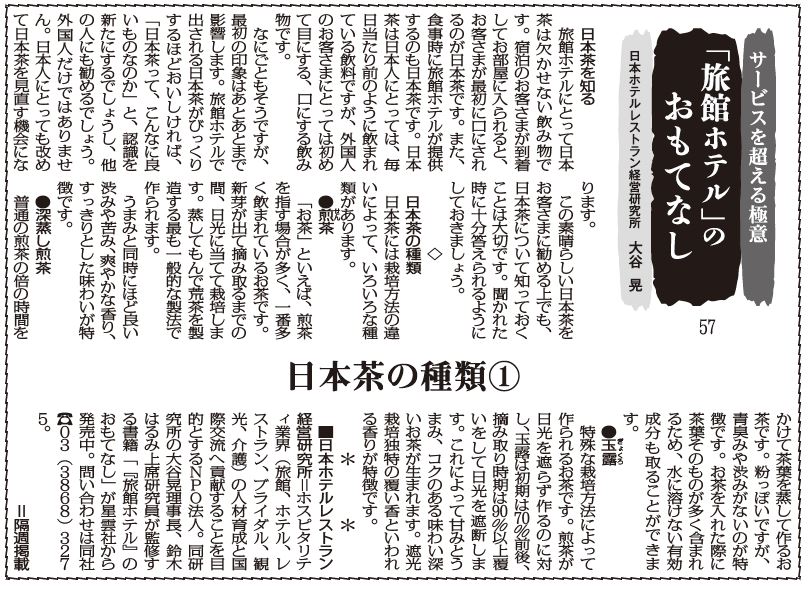 ■日本ホテルレストラン経営研究所=ホスピタリティ業界(旅館、ホテル、レストラン、ブライダル、観光、介護)の人材育成と国際交流へ貢献することを目的とするNPO法人。同研究所の大谷晃理事長、鈴木はるみ上席研究員が監修する書籍「『旅館ホテル』のおもてなし」が星雲社から発売中。問い合わせは同社TEL03(3868)3275。