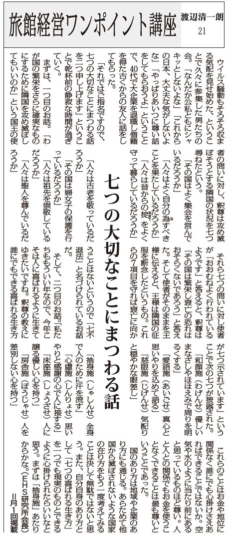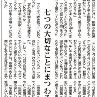 国のあり方は地域や企業のあり方にも通じる。あらためて他国から滅ぼされないような国家の在り方をもう一度考えてみることは決して無駄ではないと思う。また、自分自身のあり方として「七つの喜ばれる生き方」を一つでも現実のものとできるように心掛けられたらいいなと思う。まずは「捨身施」あたりからかな。