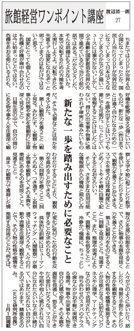 待ち合わせのスタバのテラスの席なんかがお手軽に実践できる場所。物事や出来事や人物を自分の五感で捉え、その本質や裏側を見通し、悟ることができたら面白いだろうな。マスコミや世相や他人に惑わされない自分になれたらいいなと思い続けて、いまだになれない自分がいるのではあります。精進あるのみ。 (EHS研究所会長)