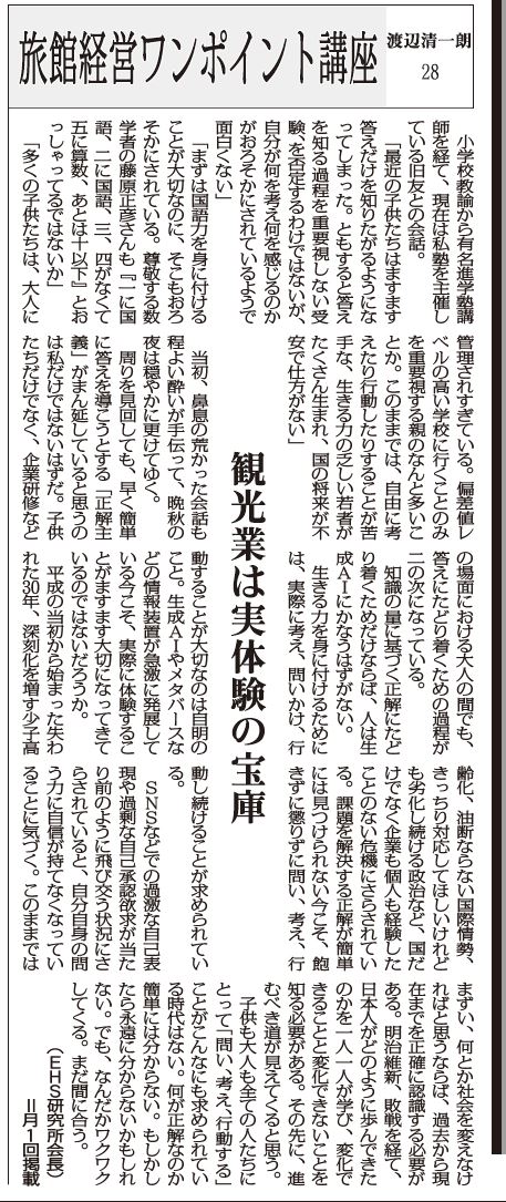 【旅館経営ワンポイント講座 28】観光業は実体験の宝庫 渡辺清一朗