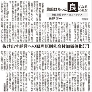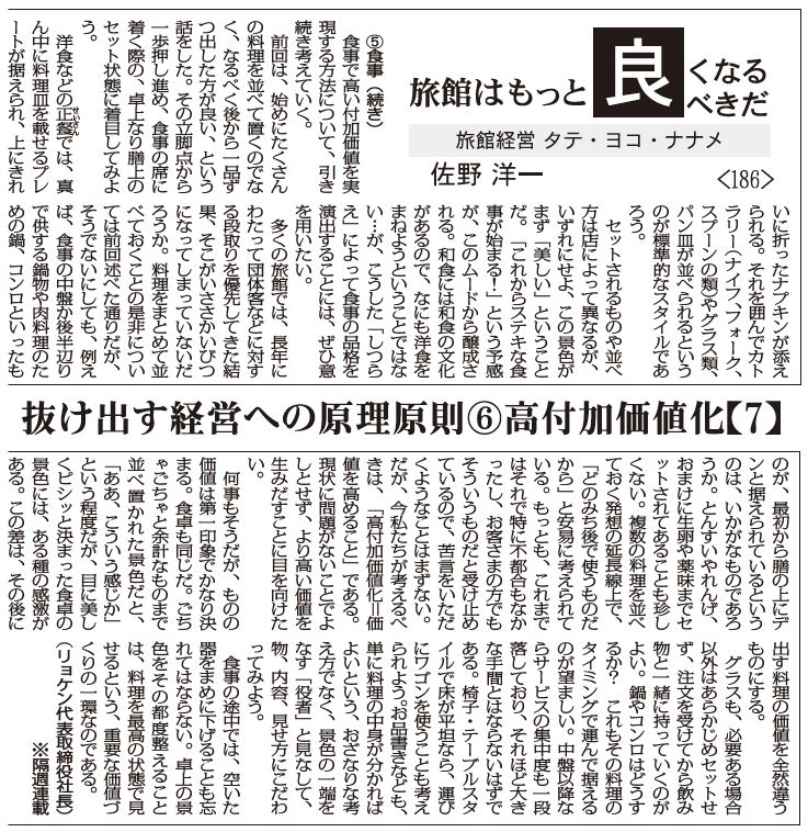 多くの旅館では、長年にわたって団体客などに対する段取りを優先してきた結果、そこがいささかいびつになってしまっていないだろうか。料理をまとめて並べておくことの是非については前回述べた通りだが、そうでないにしても、例えば、食事の中盤か後半辺りで供する鍋物や肉料理のための鍋、コンロといったものが、最初から膳の上にデンと据えられているというのは、いかがなものであろうか。とんすいやれんげ、おまけに生卵や薬味までセットされてあることも珍しくない。複数の料理を並べておく発想の延長線上で、「どのみち後で使うものだから」と安易に考えられている。もっとも、これまではそれで特に不都合もなかったし、お客さまの方でもそういうものだと受け止めているので、苦言をいただくようなことはまずない。だが、今私たちが考えるべきは、「高付加価値化=価値を高めること」である。現状に問題がないことでよしとせず、より高い価値を生みだすことに目を向けたい。