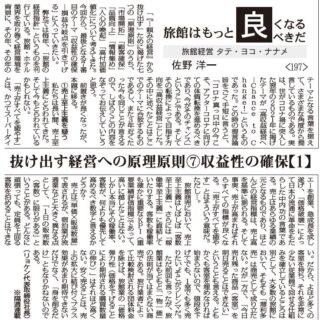 弊社では毎年、「旅館の経営指針」というものを刊行している。旅館・ホテル業界を取り巻く経営環境を背景に、その年、その年のテーマとなる言葉を据えて、さまざまな角度から提言しているものである。実は、世がコロナ禍に突入した翌年の2021年に掲げたテーマが「高収益経営へ―Chance to Change!」というものであった。この時の提言論旨をごく手短に言うと、「コロナ真っ只中の今こそ、アフターコロナに向けての体質転換を進めるべきであり、今がそのチャンス」ということである。そしてその転換によって目指す方向を「高収益経営」とした。その中に述べたことはここでのテーマに合致するものであるし、また3年近くたった今も同じことが言えるので、しばらくこの内容をなぞってお伝えしていこうと思う。