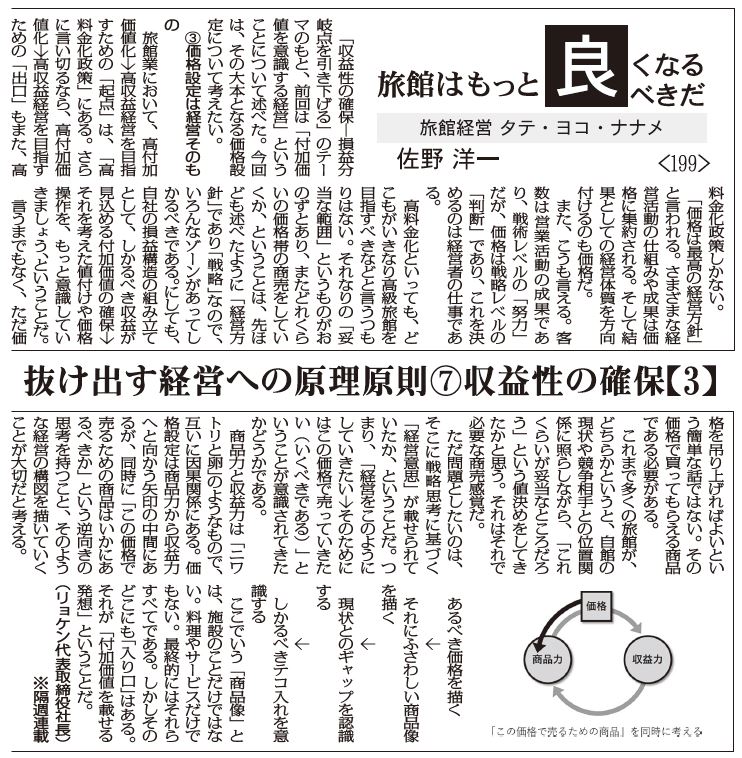 【旅館経営 タテ・ヨコ・ナナメ 199】抜け出す経営への原理原則7収益性の確保3 リョケン 代表取締役社長 佐野洋一