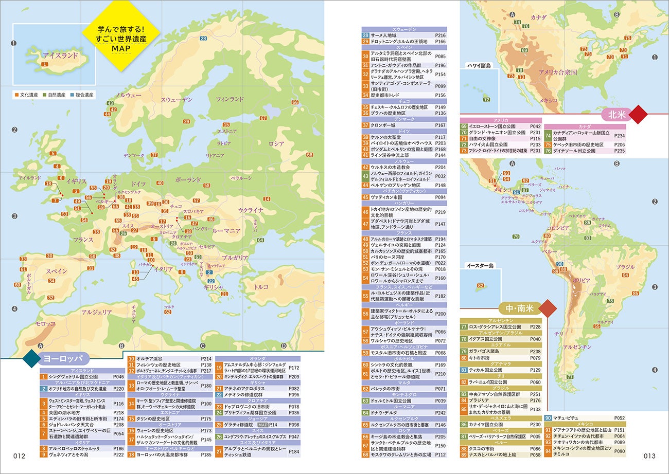 世界6エリアと日本の世界遺産MAPと国別INDEXを掲載。本書に掲載している自然遺産と文化遺産、複合遺産がひとめでわかります。