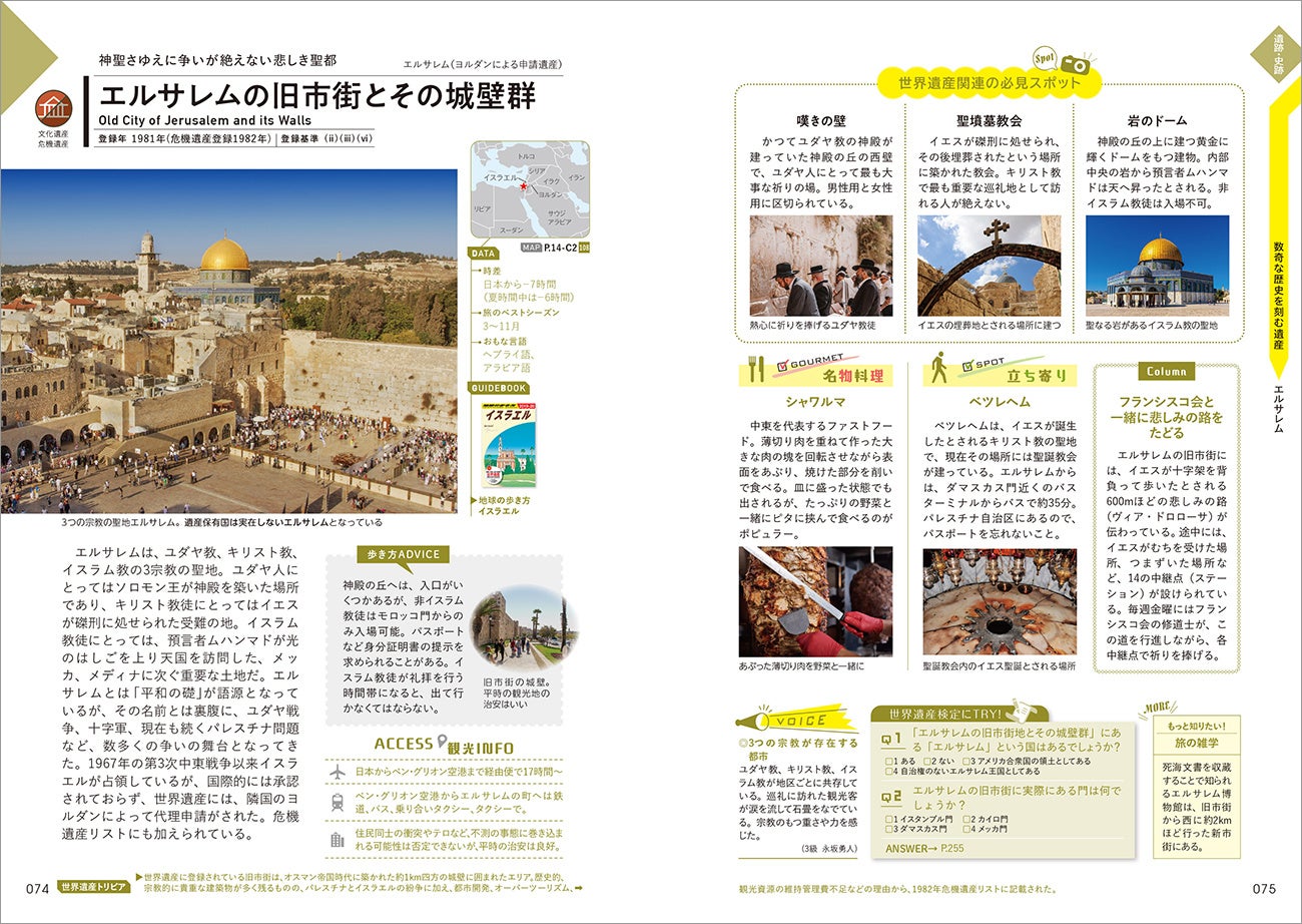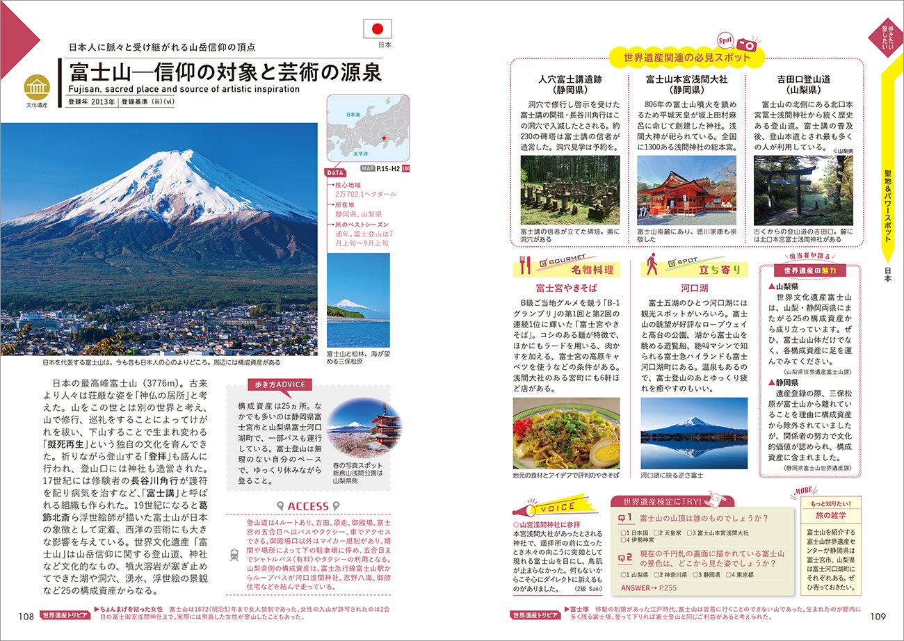 詳しい解説や最新データ、世界遺産検定に出題された問題を参考にしたクイズやトリビアなど、世界遺産を深く学べます。日本の世界遺産は登録までの苦労やウラ話なども掲載。