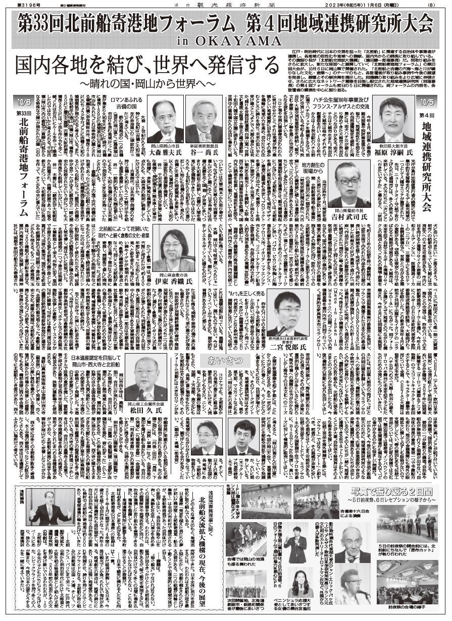 江戸・明治時代に日本の交易を担った「北前船」に関連する自治体や事業者が連携し、各地域の活性化や地域への貢献、国内外からの誘客に取り組んでいる。その旗振り役が「北前船交流拡大機構」(濵田健一郎理事長)だ。同取り組みをさらに拡大し、新たな局面へと展開していく「北前船寄港地フォーラム」の第33回大会が、10月6日に岡山県で開催された。「北前船と吉備の穴海~海と川が織りなした文化・産業~」のテーマのもと、各登壇者が取り組み事例や今後の展望を発表し、課題とその解決策を提示した。同機構の取り組みをより広域に伸張させ、さらに広大なネットワーク構築を目指し設立された地域連携研究所(同理事長)の第4回フォーラムも前日の5日に開催された。両フォーラムの内容を、各登壇者の講演を中心に振り返る。
