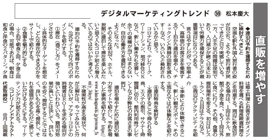 そのような状況で、ホテル、旅館に連泊して滞在を楽しみたいと思う人もコロナ前より増えているのではないかと考えている。