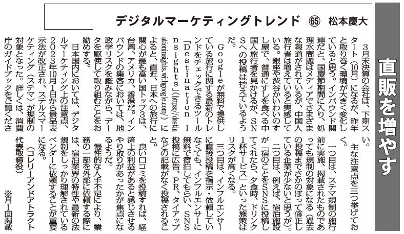 3月末決算の会社は、下期スタート(10月)になるが、昨年と取り巻く環境が大きく変化していると思う。インバウンド関連だと、国慶節期間に入り、処理水問題はメディアでさまざまな報道がされているが、中国人旅行者は増えていると実感している。銀座や渋谷かいわいのすし屋で、普通にすしを食べる中国人旅行者を見かけるが、SNSへの投稿は控えているようだ。